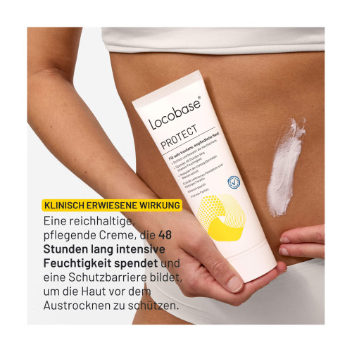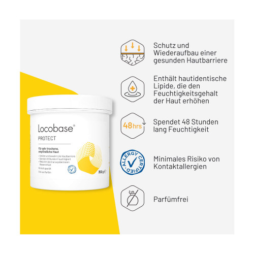 Locobase PROTECT kombiniert die Eigenschaften aus Creme und Salbe. Sie hat zugleich einen hohen Wasser- und einen hohen Lipidanteil. Sie schützt die Haut durch eine atmungsaktive Lipidbarriere und erhöht deren Feuchtigkeitsgehalt. Sie spendet sofort intensive Feuchtigkeit und verbessert die Elastizität der Haut.