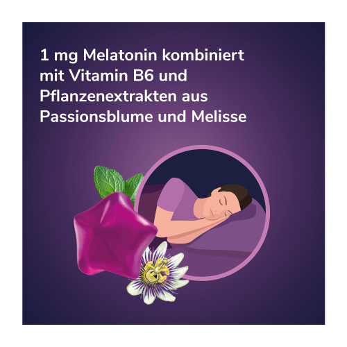 Süßungsmittel: Maltitsirup, Sorbitsirup; Geliermittel: Pektin; Süßungsmittel: Sorbit; Trockenextrakt aus Melissenblättern; Säureregulatoren: Citronensäure, Trinatriumcitrat; Trockenextrakt aus Passionsblumenkraut; natürliches Aroma; Farbstoff: Anthocyane; färbendes Lebensmittel Spirulina-Konzentrat; pflanzliches Öl (Kokosöl); Überzugsmittel: Carnaubawachs; Vitamin B6 (Pyridoxinhydrochlorid); Melatonin.