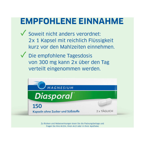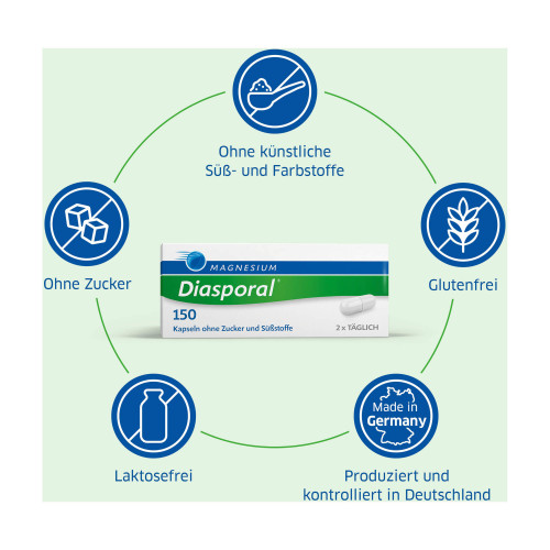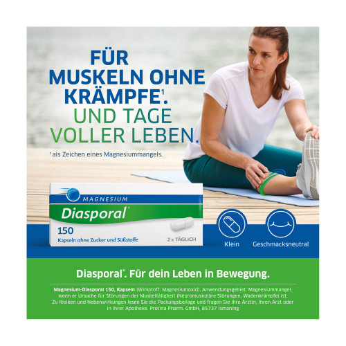 Magnesium-Diasporal® 150, Kapseln. Wirkstoff: Magnesiumoxid. Anwendungsgebiete: Magnesiummangel, wenn er Ursache für Störungen der Muskeltätigkeit (Neuromuskuläre Störungen, Wadenkrämpfe) ist.