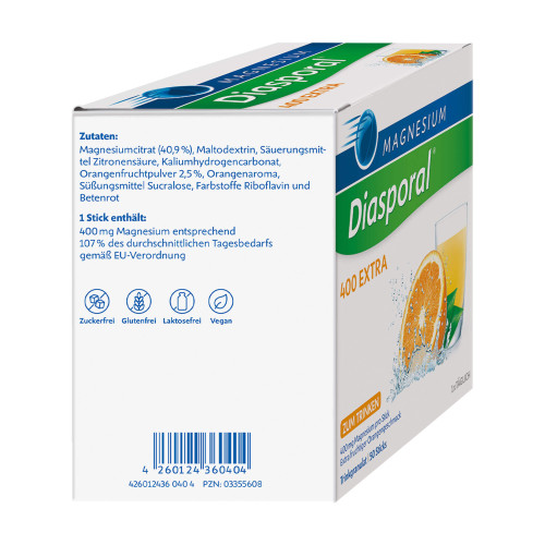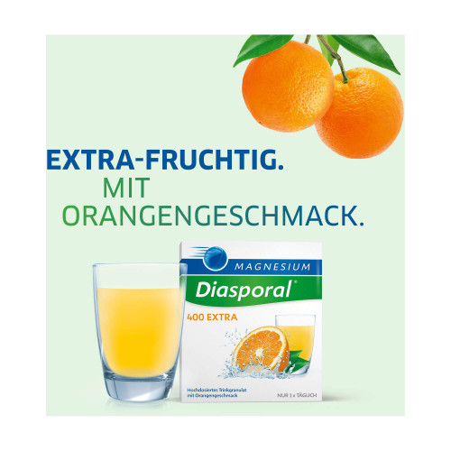 Magnesium-Diasporal® 400 EXTRA enthält reines Magnesiumcitrat, das als organische Verbindung körperfreundlich und schnell aktiv ist. Das Trinkgranulat schmeckt extra fruchtig und versorgt den Körper zusätzlich mit Flüssigkeit. Für den erhöhten Magnesiumbedarf.