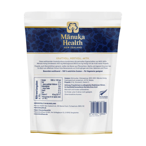 Rohrzucker, Glukosesirup, MGO 400+ Manuka Honig (Leptospermum scoparium, 4,5 %), Wasser, Propolis (2 %), Zitronenöl, Vitamin C.