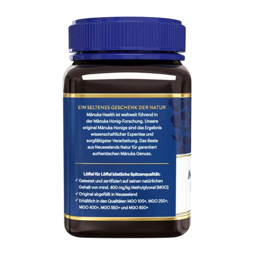 Der beliebteste und der Bestseller unter den Mānuka Health Honigen ist der MGO 400+. Der köstliche MGO 400+ Mānuka-Honig von Mānuka Health ist zertifiziert für eine natürliche Methylglyoxal-Qualität (MGO) von mindestens 400 mg pro kg Honig. Er eignet sich ideal für die tägliche Einnahme zur Steigerung des Wohlbefindens.
