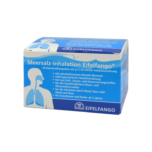 Die Inhalation kann mit kompressorbetriebenen Düsenverneblern oder Ultraschallverneblern mit geeigneten Aufsätzen für Mund und/oder Nase erfolgen. Je nach Gerätebauart und erzeugter Tröpfchengröße kann das Volumen, das in die Geräte eingefüllt werden muss, unterschiedlich sein. In jedem Fall sollte das Gerät so gefüllt sein, dass eine Inhalationsdauer von etwa 10 Minuten, bei gleichzeitiger Inhalation von mindestens 2 - 3 ml, garantiert ist. Die Lösung wird unverdünnt inhaliert. Je nach Bedarf sollten Sie bei akuten Erkrankungen bis zu 4 mal täglich 3 - 5 ml Meersalz-Inhalation Eifelfango inhalieren. Zur Vorbeugung oder bei länger andauernder Anwendung werden 2 - 3 mal täglich etwa 3 ml Lösung inhaliert. Die Inhalation sollte etwa 10 - 15 Minuten dauern. Die Inhalationslösung sollte vor Gebrauch auf Raumtemperatur angewärmt werden. Patienten, die bronchienerweiternde Medikamente inhalieren, sollten diese vor der Inhalation von Meersalz-Inhalation Eifelfango anwenden.