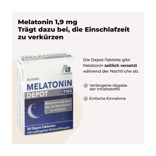 Avitale Melatonin Depot 1,9 mg enthält 1,9 mg Melatonin pro Tablette. Das Präparat gibt den Wirkstoff Melatonin zeitlich versetzt während der gesamten Nachtruhe ab. Dies unterstützt den Organismus beim schnelleren Einschlafen.