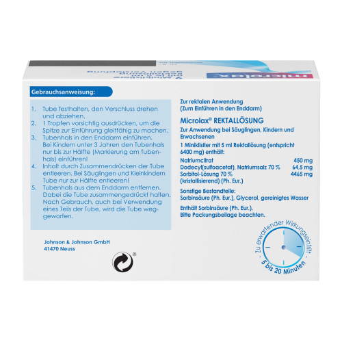 Speziell für Säuglinge und Kinder bis 6 Jahren ist Microlax auch als Microlax Rektallösung mit kurzem Tubenhals (PZN 18713829) erhältlich.