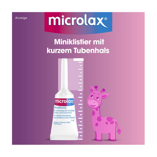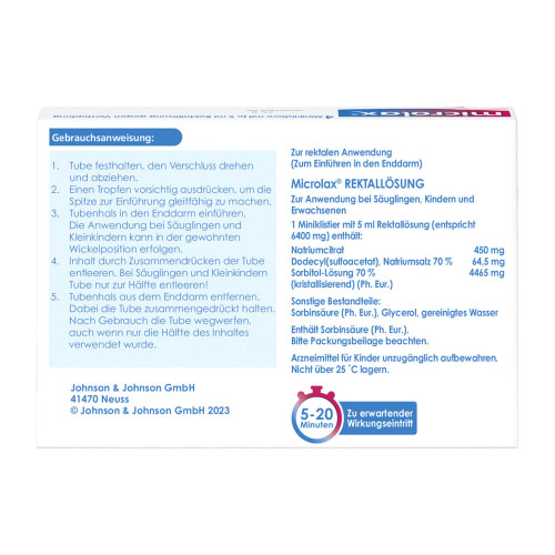 Microlax Rektallösung. Anwendungsgebiete: Zur kurzfristigen Anwendung bei Verstopfung (Obstipation) sowie bei Erkrankungen, die eine erleichterte Stuhlentleerung (Defäkation) erfordern. Zur Darmentleerung bei diagnostischen oder therapeutischen Maßnahmen im Enddarmbereich. Warnhinweis: Enthält Sorbinsäure.