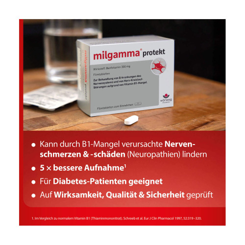 milgamma® protekt. Wirkstoff: Benfotiamin. Anwendungsgebiete: Gesicherte Anwendungsgebiete für die Monopräparate sind ausschließlich Therapie oder Prophylaxe von klinischen Vitamin-B1-Mangelzuständen, sofern diese nicht ernährungsmäßig behoben werden können.