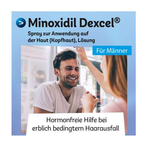 Minoxidil Dexcel 50 mg/ml Spray zur Anwendung auf der Haut (Kopfhaut), Lösung. Anwendungsgebiete: Stabilisiert bei Männern im Alter von 18-49 Jahren den Verlauf des anlagebedingten Haarverlustes im Tonsurbereich der Kopfhaut von 3-10 cm Durchmesser (androgenetische Alopezie vom männlichen Typ) und kann so dem Fortschreiten dieses Haarverlustes entgegenwirken. Beginn und Ausmaß dieser Wirkung können individuell unterschiedlich sein und sind nicht vorhersagbar. Warnhinweise: Enthält Propylenglycol und Ethanol. Direkten Kontakt mit offenen Flammen, Zigaretten oder anderen Brandquellen vermeiden.
