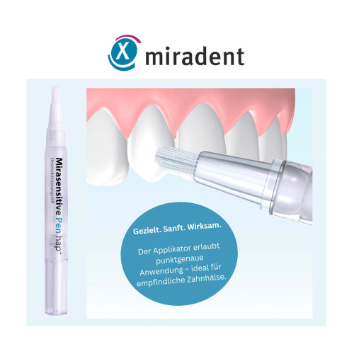 Der mirasensitive hap+ Pen von miradent ist ein innovatives Desensibilisierungsgel zur kosmetischen Pflege empfindlicher Zahnbereiche. Die Rezeptur enthält Hydroxylapatit, das eine schützende, zahnschmelzähnliche Schicht bildet, sowie Kalium-Ionen, die speziell für sensible Zahnregionen geeignet sind.