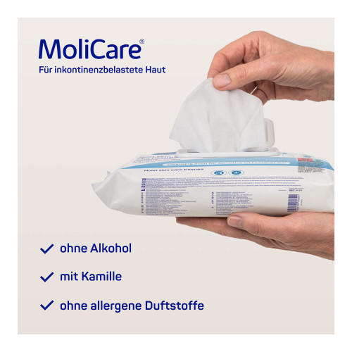 Bequeme und zeitsparende Reinigung für die Inkontinenz- pflege, getränkt mit Reinigungs-lotion. Dermatologisch getestet; für empfindliche Haut geeignet. Frei von Allergenen. pH-hautneutral, milde, alkoholfreie Rezeptur.