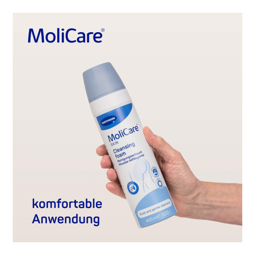 Reinigungsschaum ist für die Verwendung ohne Wasser bestimmt. Durch die wasserfreie Anwendung von MoliCare Skin Reinigungsprodukten bleibt der natürliche Säureschutzmantel der Haut erhalten.