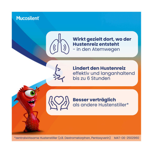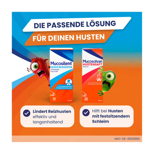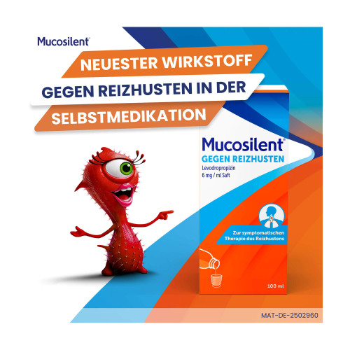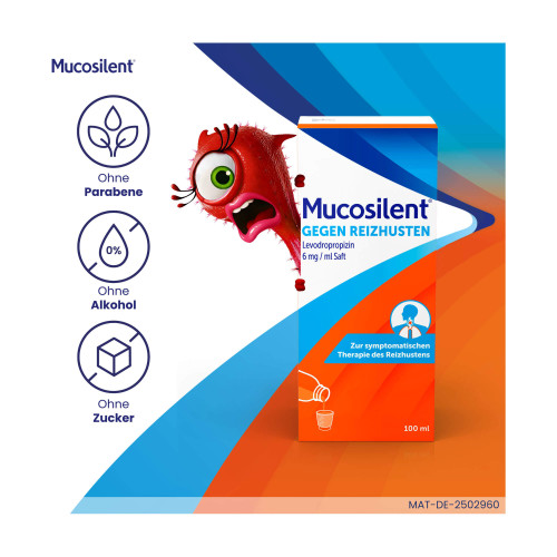 Mucosilent® gegen Reizhusten Levodropropizin 6 mg/ml Saft. Wirkstoff: Levodropropizin. Anwendungsgebiete: Symptomatische Therapie des Reizhustens (unproduktiver Husten).