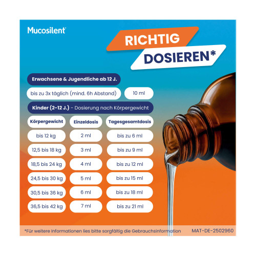 Die empfohlene Dosis beträgt eine Einzeldosis 10 ml Mucosilent (entsprechend 60 mg Levodropropizin) bis zu dreimal täglich. Es müssen jedoch mindestens 6 Stunden bis zur nächsten Einnahme vergangen sein.