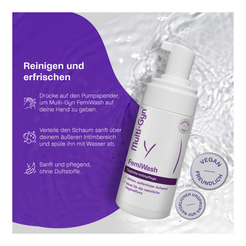 Multi-Gyn FemiWash ist ideal für die tägliche Intimpflege und auch hervorragend für eine sanfte Rasur geeignet. Der Multi-Gyn FemiWash reinigt und erfrischt den Intimbereich. Der Mikroschaum ist mild und angenehm, auch bei sehr empfindlicher und überempfindlicher Haut. - Reicht für ca. 120 Anwendungen