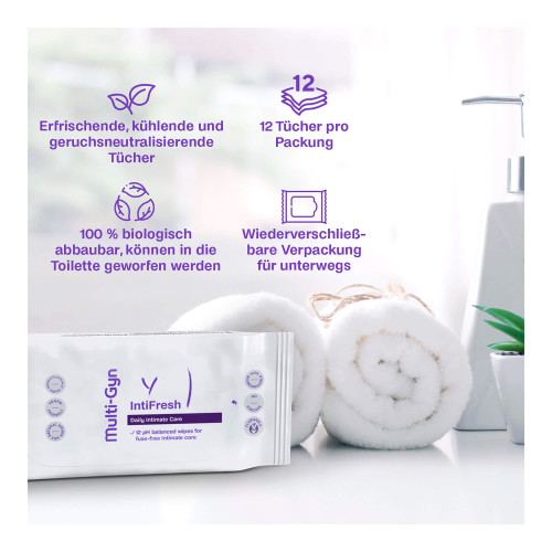 Die praktische, wiederverschließbare Verpackung der Multi-Gyn IntiFresh Pflegetücher ist die ideale Lösung für die Intimpflege unterwegs.