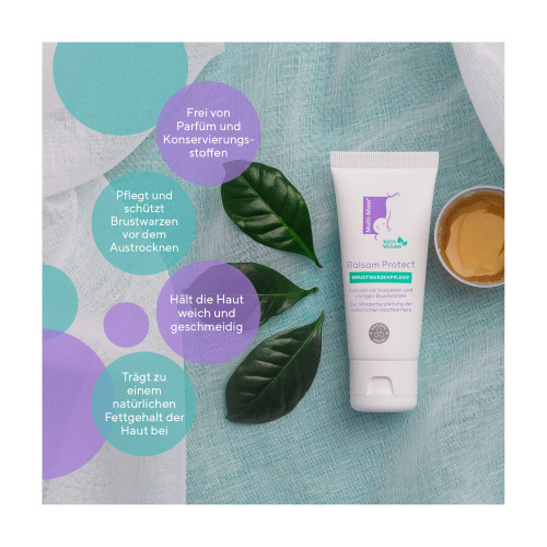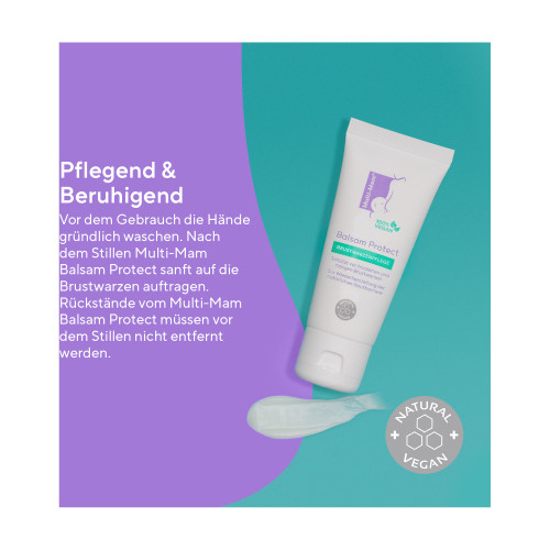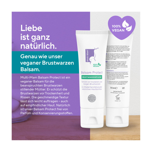 Multi-Mam Balsam Protect ist ein veganer Brustwarzen-Balsam, der hauptsächlich auf pflanzlichen Ölen und Fetten basiert und die Brustwarzen während des Stillens vor Trockenheit und Rissen schützt. Dank der geschmeidigen, sanften Textur lässt er sich selbst auf empfindlicher Haut besonders leicht auftragen. Natürlich ist Multi Mam Balsam Protect frei von Duft- und Konservierungsstoffen. Der Balsam muss vor dem Stillen nicht entfernt werden und ist dermatologisch getestet.
