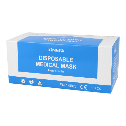 Maske nach EN 14683 Typ I aus PP-Vliesstoff, PP-Schmelzgeblasenemgewebe, Nasenclip und Ohrschlaufen. Es handelt sich um eine nicht sterile Einweg-Maske zum einmaligen Gebrauch mit einer Bakterienfiltereffizienz (BFE): >95%.