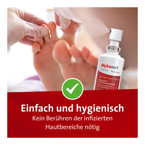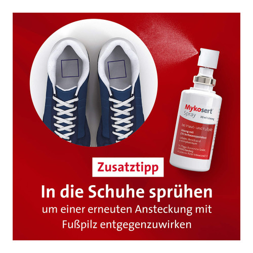 Mykosert Spray bei Haut- und Fußpilz, Lösung. Wirkstoff: Sertaconazolnitrat. Anwendung: Pityriasis versicolor sowie bei Pilzinfektion der Haut, die durch Dermatophyten verursacht werden (z.B. Fußpilz). Warnhinweise: Enthält Propylenglycol, Glycerinformal und 634 mg Alkohol (Ethanol) pro 1 ml Lösung.
