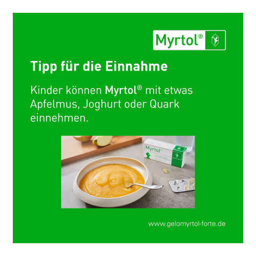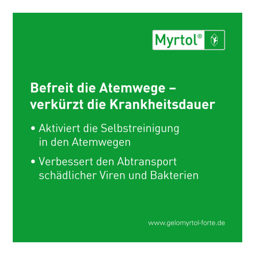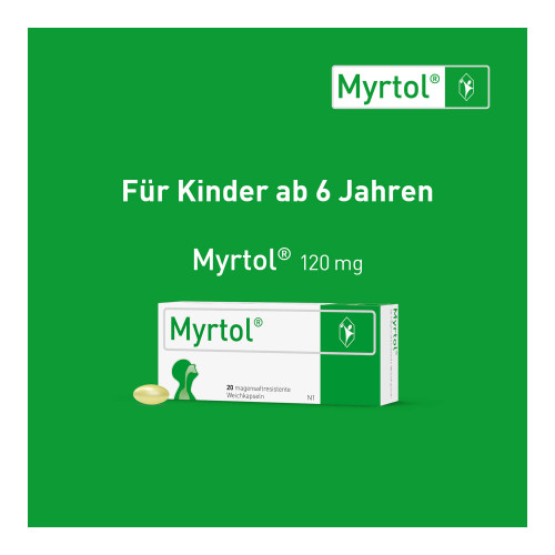 Myrtol® 120 mg, magensaftresistente Weichkapseln. Anwendungsgebiete: Zur Schleimlösung und Erleichterung des Abhustens bei akuter und chronischer Bronchitis. Zur Schleimlösung bei Entzündungen der Nasennebenhöhlen (Sinusitis). Zur Anwendung bei Erwachsenen, Jugendlichen und Kindern ab 6 Jahren. Warnhinweis: Enthält Sorbitol.