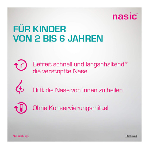 nasic® für Kinder O.K.. Anwendungsgebiete: Zur Abschwellung der Nasenschleimhaut bei Schnupfen und zur unterstützenden Behandlung der Heilung von Haut- und Schleimhautschäden, anfallsweise auftretendem Fließschnupfen und zur Behandlung der Nasenatmungsbehinderung nach operativen Eingriffen an der Nase. nasic® für Kinder O.K. ist für Kinder zwischen 2 und 6 Jahren bestimmt.