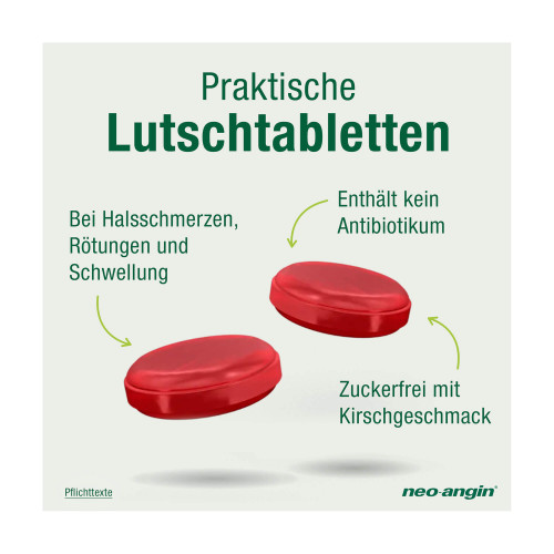neo-angin® Halstabletten Kirsche. Anwendungsgebiete: Zur unterstützenden Behandlung bei Entzündungen der Rachenschleimhaut, die mit typischen Symptomen wie Halsschmerzen, Rötung oder Schwellung einhergehen. Zur Anwendung bei Erwachsenen und Kindern ab 6 Jahren. Warnhinweise: Enthält Ponceau 4R (E 124), Benzylalkohol, Butylhydroxyanisol (E 320) und lsomalt (E 953).