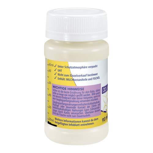 Die Trinkmenge je Fläschchen kann individuell unterschiedlich sein. Die empfohlene Trinkmenge und Anzahl der Fläschchen sind Richtwerte. Nach dem 4. Monat können Sie in Absprache mit dem Kinderarzt mit der Fütterung von Gläschen und Breien beginnen. Mit jeder Beikostmahlzeit sollte ein Fläschchen entfallen.