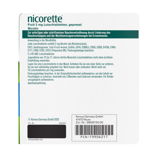 Nicorette fruit 2 mg Lutschtabletten, gepresst. Wirkstoff: Nicotin (als Nicotinresinat). Anwendungsgebiete: Zur Behandlung der Tabakabhängigkeit durch Linderung der Nicotinentzugserscheinungen und Verringerung des Nicotinverlangens für Raucher mit geringer Tabakabhängigkeit ab 18 Jahren. Zum sofortigen Rauchstopp sowie zur Verringerung des Zigarettenkonsums (Rauchreduktion), um auf diesem Wege schrittweise den Rauchausstieg zu erreichen.