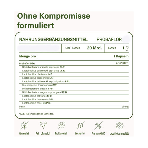 Nupure probaflor enthält 20 Mrd. KBE (Koloniebildende Einheiten) pro Kapsel. Um diese im Vergleich zu ähnlichen Produkten hohe Menge an Lebendkulturen zu gewährleisten, wird nupure probaflor unter Luftausschluss verpackt. Dies sichert die Lieferung eines vor Sauerstoff und Feuchtigkeit geschützten Produkts.