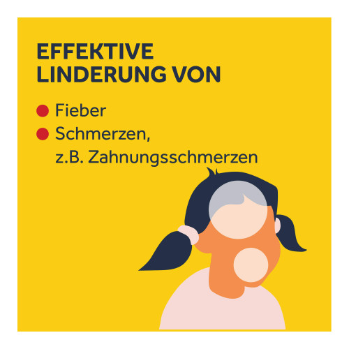 Nurofen Junior Fieber- und Schmerzsaft Orange 40 mg/ml Suspension zum Einnehmen. Wirkstoff: Ibuprofen. Anwendungsgebiete: Kurzzeitige symptomatische Behandlung leichter bis mäßig starker Schmerzen, Fieber. Warnhinweise: Enthält Maltitol und Natrium sowie Erdbeeraroma (enthält Propylenglycol).