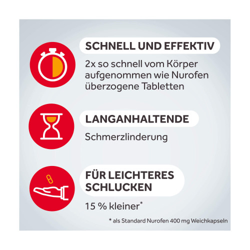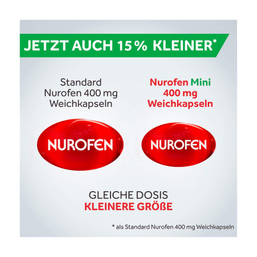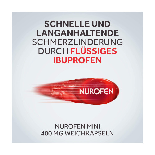 Nurofen Mini 400 mg Weichkapseln. Wirkstoff: Ibuprofen. Anwendungsgebiete: Kurzzeitige symptomatische Behandlung leichter bis mäßig starker Schmerzen, Fieber, Schmerzen in Zusammenhang mit Erkältungen. Warnhinweise: Bei Schmerzen oder Fieber ohne ärztlichen Rat nicht länger anwenden als in der Packungsbeilage vorgegeben! Enthält: Ponceau 4R (E124), Phospholipide aus Sojabohnen und Sorbitol (E420).