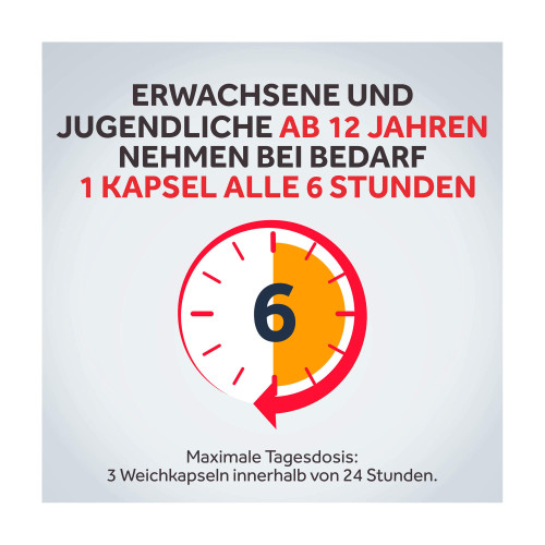 Anfangsdosis: Nehmen Sie 1 Kapsel (400 mg Ibuprofen) mit Wasser ein. Falls erforderlich, nehmen Sie weitere Dosen von 1 Kapsel (400 mg Ibuprofen) ein, aber überschreiten Sie nicht die Gesamtdosis von 3 Kapseln (1200 mg Ibuprofen) in einem Zeitraum von 24 Stunden. Das Dosierungsintervall sollte 6 Stunden nicht unterschreiten.
