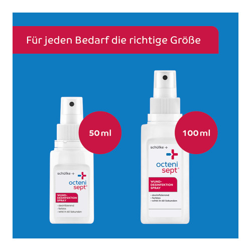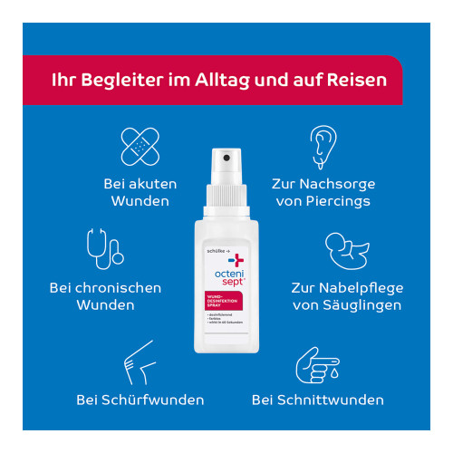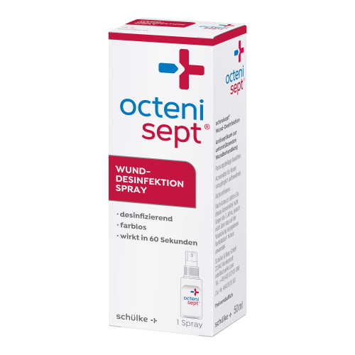octenisept® Wund-Desinfektion. Anwendungsgebiete: octenisept® Wund-Desinfektion ist ein Antiseptikum zur wiederholten, zeitlich begrenzten unterstützenden antiseptischen Wundbehandlung. Farbloses, sehr verträgliches Spray zur Desinfektion und Nachreinigung von Schnitt-, Kratz- und Schürfwunden sowie offenen Blasen – schnell und einfach in der Anwendung! Warnhinweise und Vorsichtsmaßnahmen für die Anwendung: Um möglichen Gewebeschädigungen vorzubeugen, darf das Präparat nicht unter Druck ins Gewebe eingebracht bzw. injiziert werden. Bei Wundkavitäten muss ein Abfluss jederzeit gewährleistet sein (z.B. Drainage, Lasche). octenisept® Wund-Desinfektion nicht in größeren Mengen verschlucken oder in den Blutkreislauf, z.B. durch versehentliche Injektion, gelangen lassen. Die Anwendung von octenisept® Wund-Desinfektion im Auge ist zu vermeiden. Bei versehentlichem Augenkontakt sofort mit viel Wasser spülen.