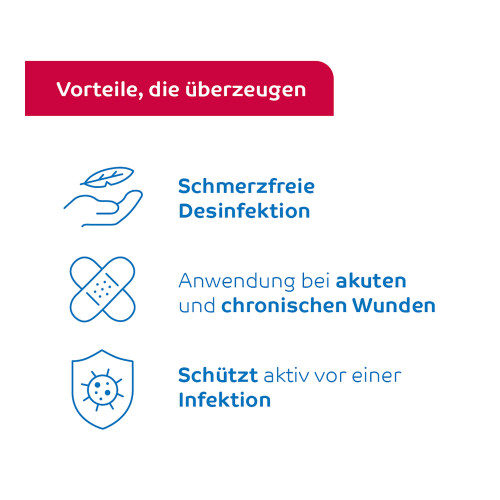 Die Wunde muss dabei vollständig benetzt werden. Warten Sie vor weiteren Maßnahmen, wie z. B. dem Anlegen eines Wundverbandes, die Mindesteinwirkzeit von 1 bis 2 Minuten ab. Um die gewünschte Wirkung zu erreichen, sind diese Vorgaben sorgfältig einzuhalten.