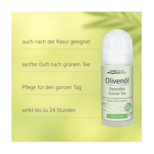 Der Olivenöl Deoroller Grüner Tee von medipharma cosmetics vereint Deo-Schutz mit sanfter Pflege. Die milde Formulierung mit kaltgepresstem Olivenöl schützt zuverlässig vor Körpergeruch und sorgt für ein angenehm frisches Hautgefühl – bis zu 24 Stunden. Gleichzeitig wird die Transpiration reguliert, ohne die natürliche Hautbalance zu beeinträchtigen.