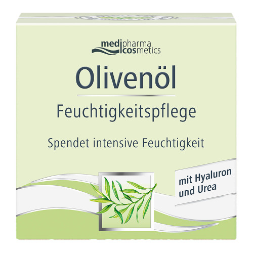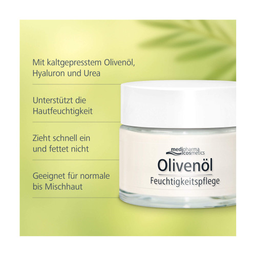Die medipharma cosmetics Olivenöl Feuchtigkeitspflege versorgt normale bis Mischhaut mit intensiver Feuchtigkeit. Die Formel mit kaltgepresstem Olivenöl, Hyaluron und Urea unterstützt den Feuchtigkeitshaushalt der Haut und bewahrt sie vor dem Austrocknen. Olivenöl wird seit Jahrhunderten für die Hautpflege geschätzt. Es versorgt die Haut mit Lipiden und unterstützt ihre natürliche Schutzfunktion. In Kombination mit weiteren pflegenden Inhaltsstoffen trägt es dazu bei, die Haut geschmeidig und gepflegt zu halten. Shea Butter pflegt zusätzlich und verleiht ein geschmeidiges Hautgefühl.