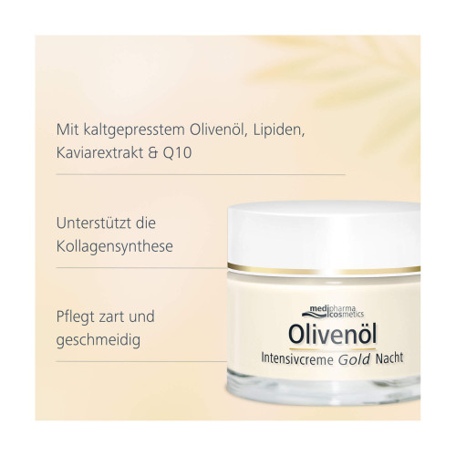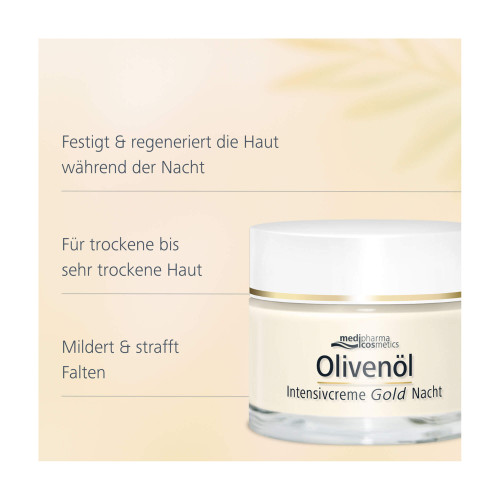 Die Olivenöl Intensivcreme Gold Zell-Aktiv Nachtcreme wurde speziell für die Bedürfnisse trockener bis sehr trockener Haut entwickelt. Als intensive Nachtpflege begleitet sie die Haut durch die nächtliche Regenerationsphase und sorgt für ein gepflegtes, geschmeidiges Hautgefühl am Morgen.