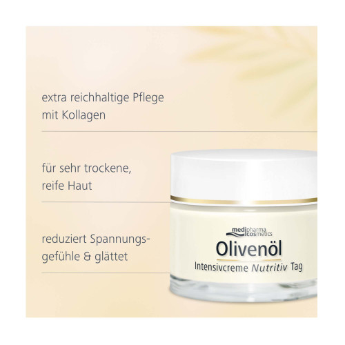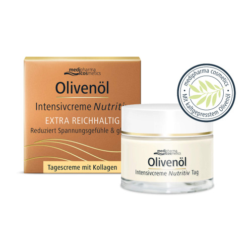Die Olivenöl Intensivcreme Nutritiv Tagescreme wurde speziell auf die Bedürfnisse von reifer Haut abgestimmt. Mit kaltgepresstem Olivenöl, pflegender Sheabutter und Kollagen spendet sie intensive Feuchtigkeit, reduziert Spannungsgefühle und sorgt für ein angenehm entspanntes Hautgefühl.