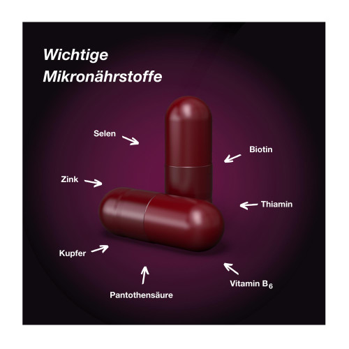 1 Biotin, Selen und Zink tragen zum Erhalt normaler Haare bei. Kupfer trägt zu einer normalen Haarpigmentierung bei. Zink, Kupfer und Selen tragen dazu bei, die Zellen vor oxidativem Stress zu schützen. Thiamin (Vitamin B1), Vitamin B6, Vitamin B12, Biotin, Pantothensäure und Kupfer tragen zu einem normalen Energiestoffwechsel bei. Vitamin B6 trägt zur normalen Cystein-Synthese bei. Pantothensäure trägt zur normalen Synthese und zum normalen Stoffwechsel von Steroidhormonen, Vitamin D und einigen Neurotransmittern bei.