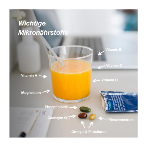 Dextrose, Maltodextrin, Fischöl (5,3 %), Magnesiumsalze der Zitronensäure, Gelatine (aus Rind), Sojaöl, L-Ascorbinsäure, Säuerungsmittel Citronensäure, Orangenfruchtpulver, Soja-Lecithinkonzentrat mit Phospholipiden (aus Glycine max) (1,4 %), Feuchthaltemittel Glycerin, Stabilisator Gummi arabicum, Aroma, L-Carnitin-L-Tartrat, DL-alpha-Tocopherylacetat, wässriger Extrakt aus Grünteeblättern (aus Camellia sinensis) (0,6 %), Ginkgo biloba-Blatt-Extrakt (0,3 %), Nicotinamid, OPC-haltiger Traubenkern-Extrakt (aus Vitis vinifera) (0,2 %), Zinkgluconat, Emulgator Mono- und Diglyceride von Speisefettsäuren, Süßungsmittel Acesulfam K, Calcium-D-pantothenat, Pyridoxinhydrochlorid, Antioxidationsmittel stark tocopherolhaltige Extrakte, Thiaminmononitrat, Emulgator Soja-Lecithine, gemischte Tocopherole, Riboflavin, Farbstoff Eisenoxide, Bioflavonoid-haltiger Citrusfrucht-Extrakt (aus Citrus sp.), Coenzym Q10 (0,03 %), Beta-Carotin, Farbstoff Kupferkomplexe der Chlorophylle und Chlorophylline, Lutein-haltiger Tagetes erecta-Extrakt, Retinylacetat, Pteroylmonoglutaminsäure, Lycopin (aus Solanum lycopersicum), Natriumselenat, D-Biotin, Cholecalciferol, Cyanocobalamin.
