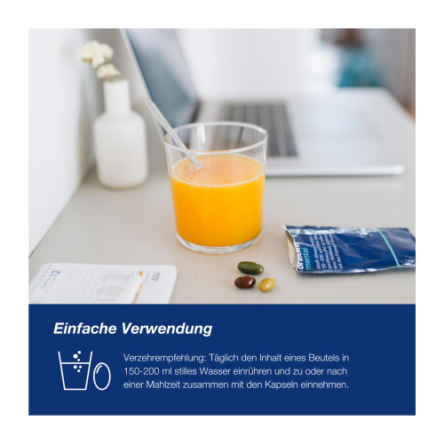 Täglich den Inhalt eines Beutels in 150 – 200 ml stilles Wasser einrühren und zu oder nach einer Mahlzeit zusammen mit den Kapseln einnehmen.