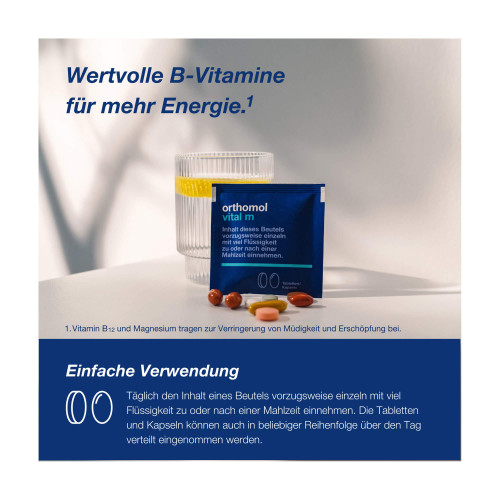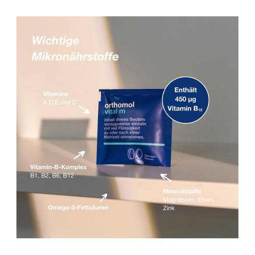 Orthomol Vital m enthält 165 µg Biotin pro Tagesportion. Wenn bei Ihnen ein Labortest (Immunassay) durchgeführt wird, informieren Sie bitte Ihren Arzt bzw. das Laborpersonal über die Einnahme von Orthomol Vital m, da Biotin solche Tests beeinflussen kann.