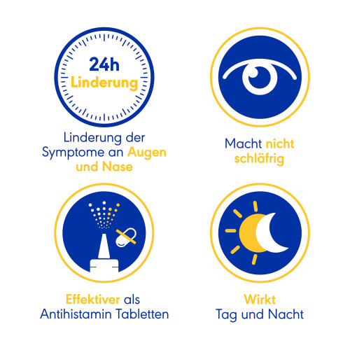 Es lindert Symptome wie Niesen, juckende und laufende Nase, juckende und tränende Augen und Verstopfung der Nase bis zu 24 Stunden.