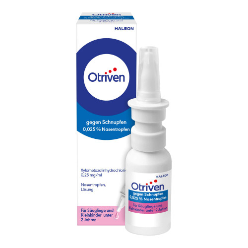 Otriven gegen Schnupfen 0,025 % Nasentropfen. Wirkstoff: Xylometazolinhydrochlorid 0,25 mg/ml. Anwendungsgebiete: Säuglinge und Kleinkinder unter 2 Jahren: Entzündungszustände der Schleimhäute im Nasen-Rachenraum (z.B. Schnupfen; zur Erleichterung des Sekretabflusses bei Nasennebenhöhlenentzündung; bei Tubenmittelohrkatarrh). Warnhinweis: Enthält Benzalkoniumchlorid.