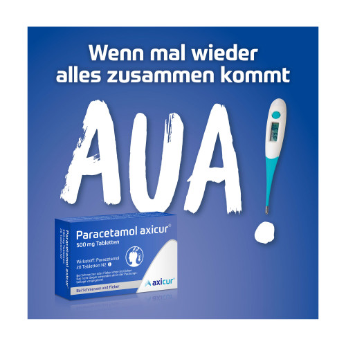 Paracetamol axicur 500 mg Tabletten. Anwendungsgebiete: Schmerzstillendes, fiebersenkendes Arzneimittel zur symptomatischen Behandlung von leichten bis mäßig starken Schmerzen wie Kopfschmerzen, Zahnschmerzen, Regelschmerzen und/oder von Fieber.