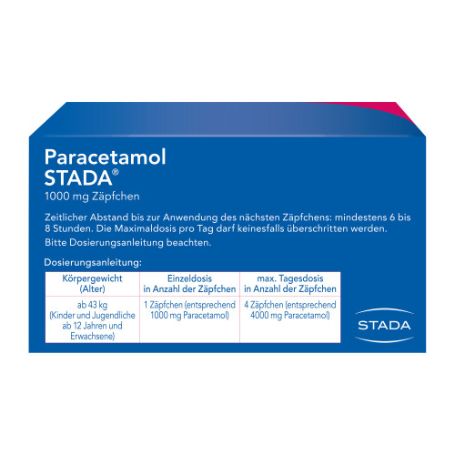 Paracetamol STADA® 1000 mg Zäpfchen. Anwendungsgebiete: Für Patienten mit einem Körpergewicht ab 43 kg (Kinder und Jugendliche ab 12 Jahren und Erwachsene). Zur symptomatischen Behandlung von leichten bis mäßig starken Schmerzen wie Kopfschmerzen, Zahnschmerzen, Regelschmerzen und/oder Fieber. Zeitlicher Abstand bis zur Anwendung des nächsten Zäpfchens: mindestens 6 bis 8 Stunden. Die Maximaldosis pro Tag darf keinesfalls überschritten werden. Bitte Dosierungsanleitung beachten. Warnhinweis: Enthält Phospholipide aus Sojabohnen.