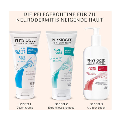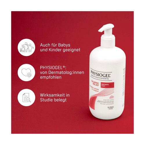Die PHYSIOGEL Calming Relief A.I. Body Lotion ist eine leichte, feuchtigkeitsspendende und beruhigende Hautpflege. Mit ihrem Wirkkomplex aus hautverwandten Lipiden und Palmitoylethanolamid (PEA) lindert sie Juckreiz und Rötungen. Zudem hilft sie, Trockenheit sowie Spannungsgefühle zu reduzieren und stärkt die natürliche Hautbarriere.