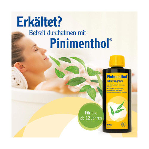 Pinimenthol® Erkältungsbad, 13,59 g / 2,19 g / 0,66 g / 100 ml flüssiger Badezusatz. Anwendungsgebiete: Zur unterstützenden Behandlung bei Erkältungskrankheiten. Das Arzneimittel ist ein traditionelles Arzneimittel, das ausschließlich aufgrund langjähriger Anwendung für das Anwendungsgebiet registriert ist.