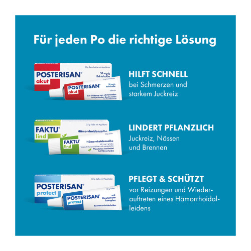 Posterisan® akut 50 mg/g Rektalsalbe. Wirkstoff: Lidocain. Anwendungsgebiete: Anwendung bei Erwachsenen. Zur Linderung von Schmerzen im Analbereich vor proktologischer Untersuchung; zur Linderung von Juckreiz im Analbereich. Warnhinweis: Enthält Cetylalkohol.