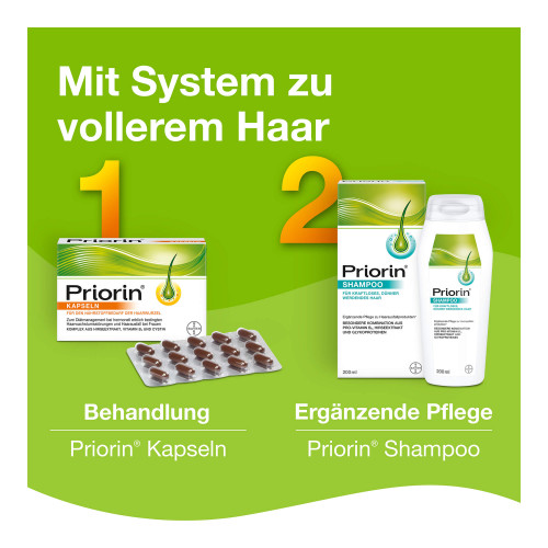 Für eine sichtbare Besserung des Haarzustandes sollte sich das Diätmanagement mit Priorin® Kapseln mindestens über einen Zeitraum von 12 Wochen erstrecken.