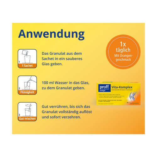 Das fruchtig-gelbs Granulat in praktischen Sachets stellt eine einfache Möglichkeit dar, den Körper täglich mit den benötigten Nährstoffen zu versorgen. Mit dem erfrischenden Geschmack von Orange ist proff Dolgit Vita-Komplex nicht nur einfach anzuwenden, sondern auch angenehm im Gebrauch.